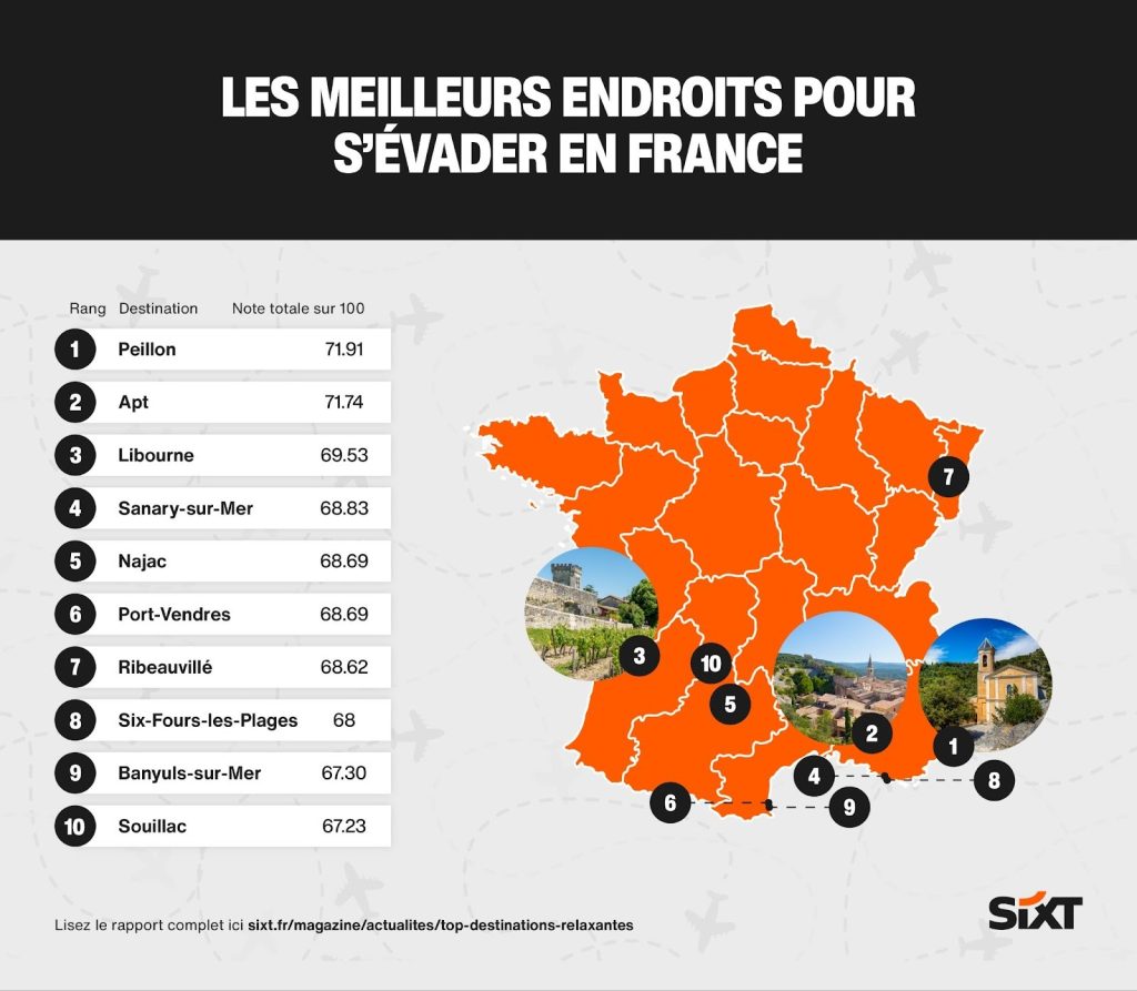 • Peillon est la meilleure destination voyage pour s’évader en France avec un score de 71,91, suivi de près par Apt, Libourne et Sanary-sur-Mer.